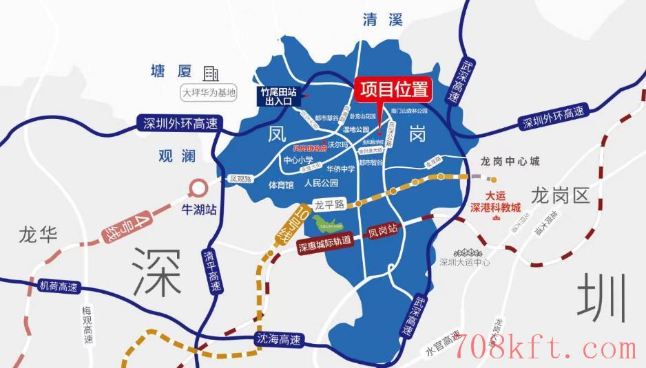 沿东深路10分钟直达深惠城轨凤岗站(建设中),1站大运、3站深圳北